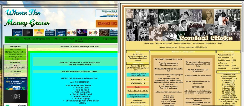 I have been a member for a bit and have had great support with fast responses when needed. There are many things to do on both sites. A good amount of people advertise there including myself. I have also upgraded my accounts a few times and plan on upgrading my accounts again soon. There is much more to say about Comical Clicks & Where The Money Grows as they are Elite earning/paying websites by my book.